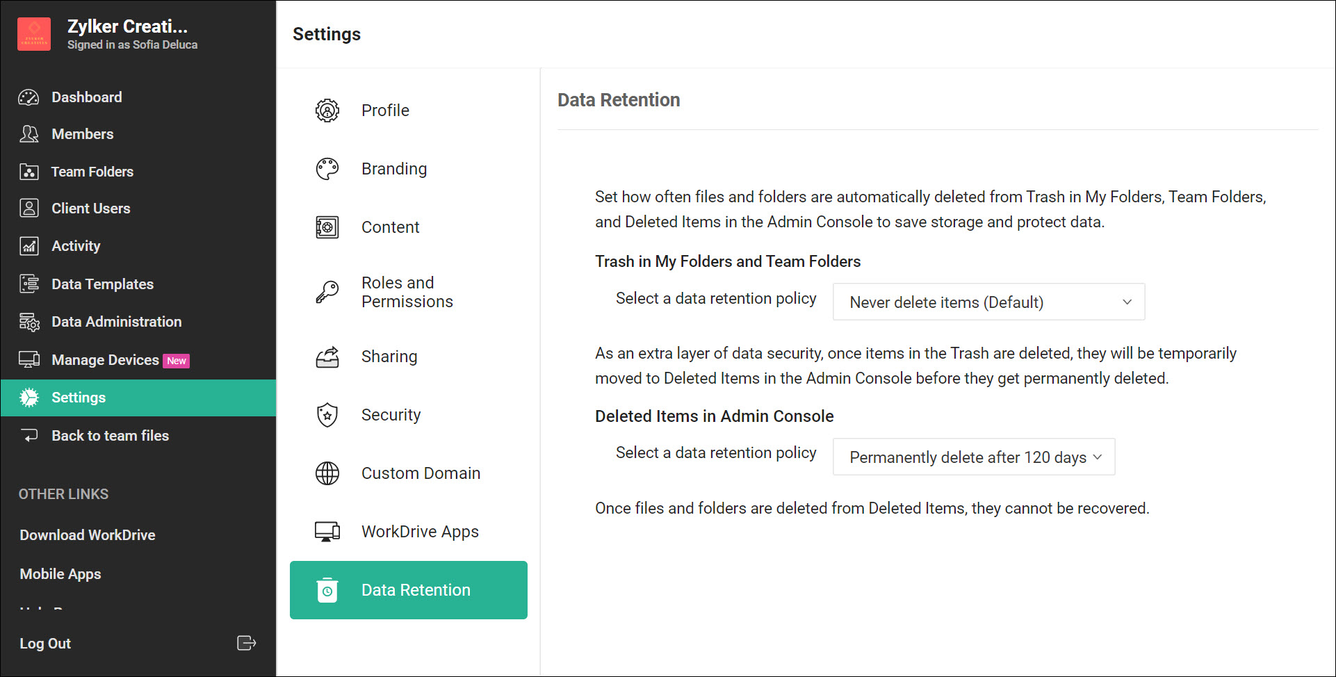 自定义数据保留政策仅适用于 WorkDrive 企业版用户和 Zoho One 用户。对于 WorkDrive 入门版和团队版,则使用默认的数据保留政策。