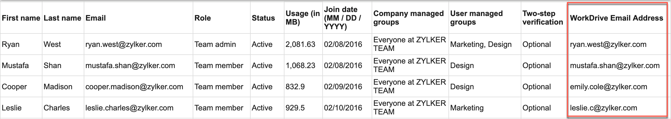 注意:如果 WorkDrive 中的用户电子邮件地址与其 Dropbox 帐户不同,请确保正确更新 WorkDrive 电子邮件地址,使其与导入到 WorkDrive 的 CSV 文件中的 Dropbox 电子邮件地址保持一致。