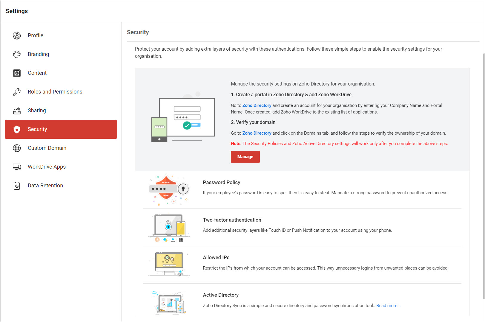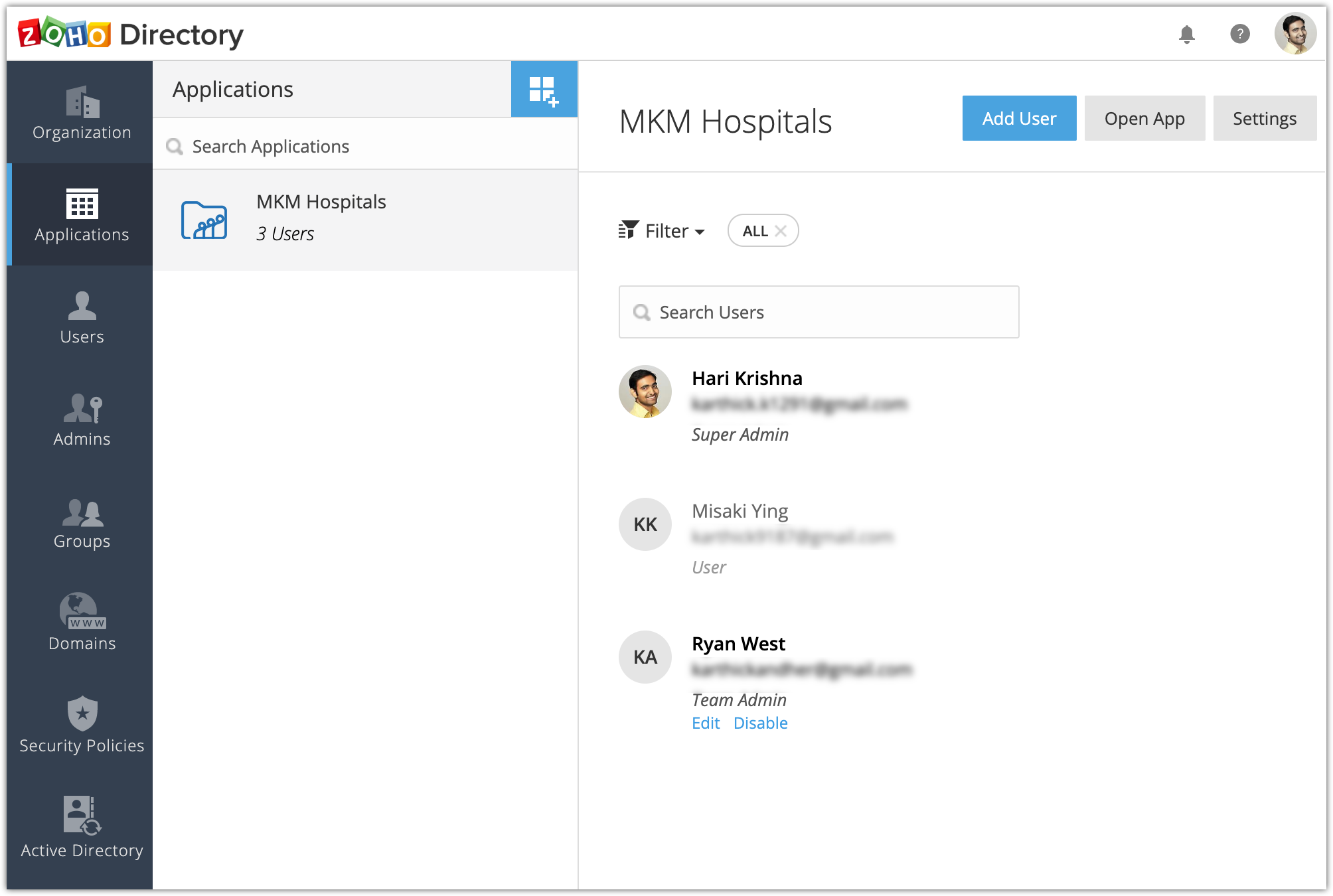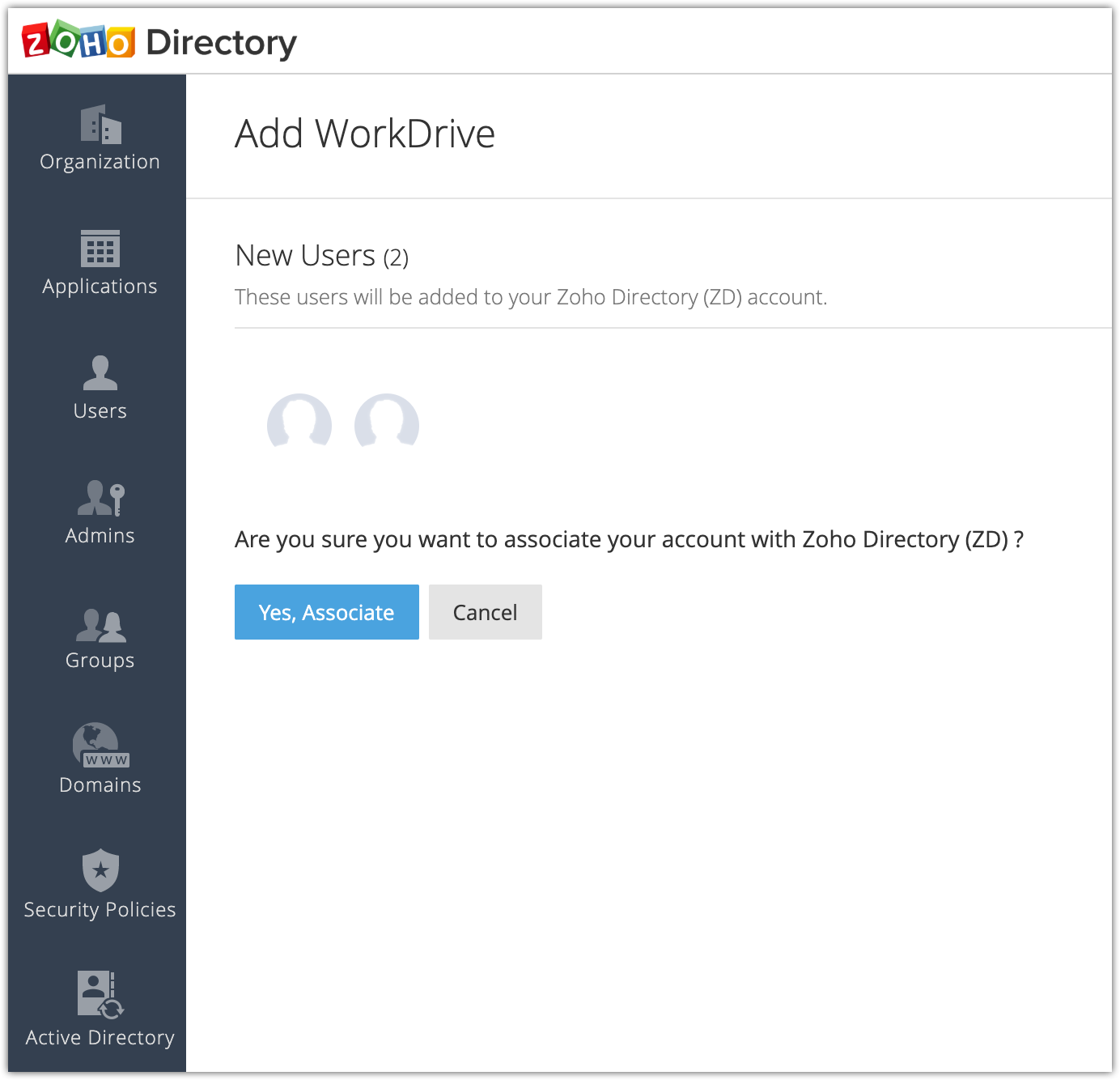 只有在 Zoho Directory 中被分配管理员角色的用户才能访问此应用,并且管理用户、安全策略、域和 Zoho Directory Sync。