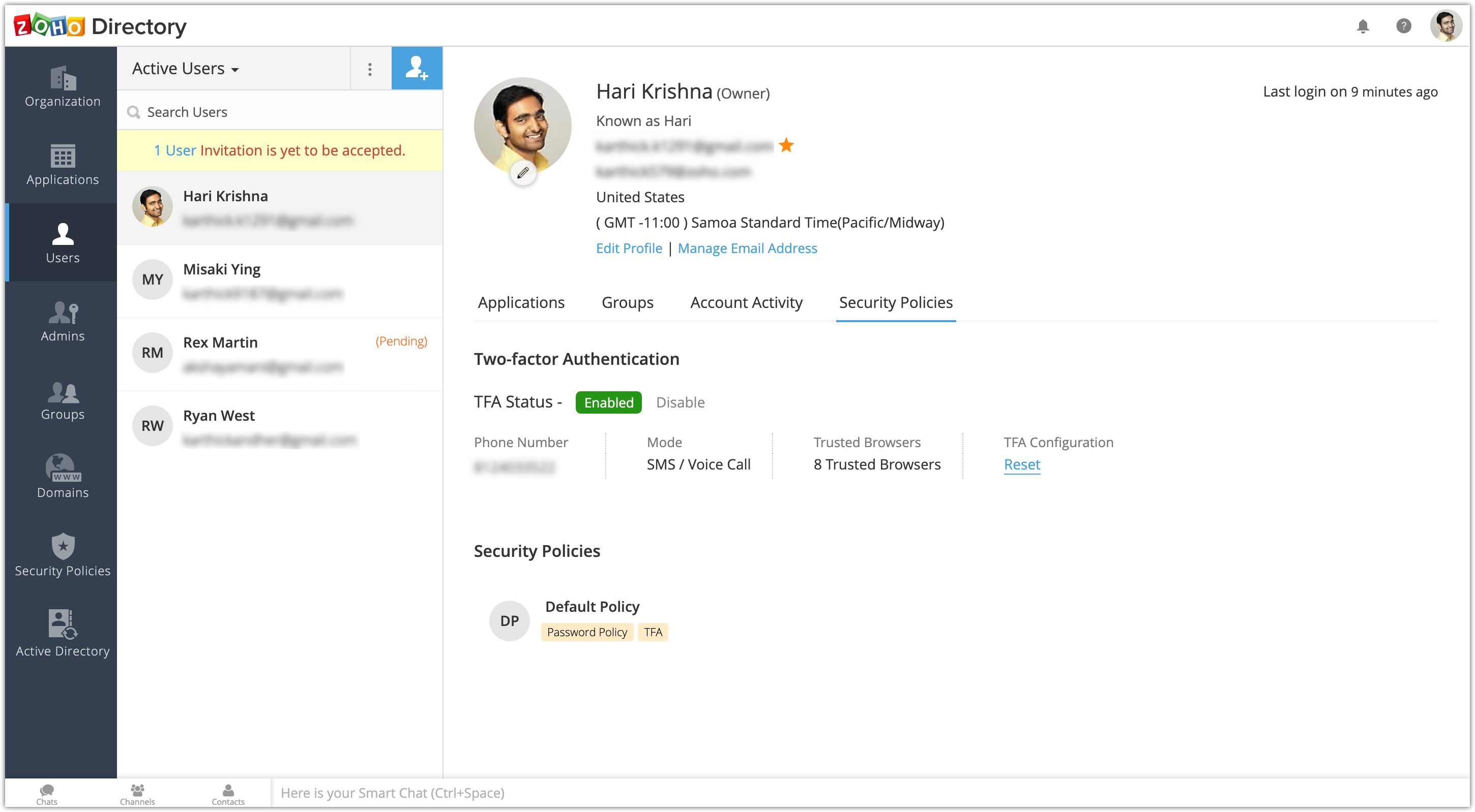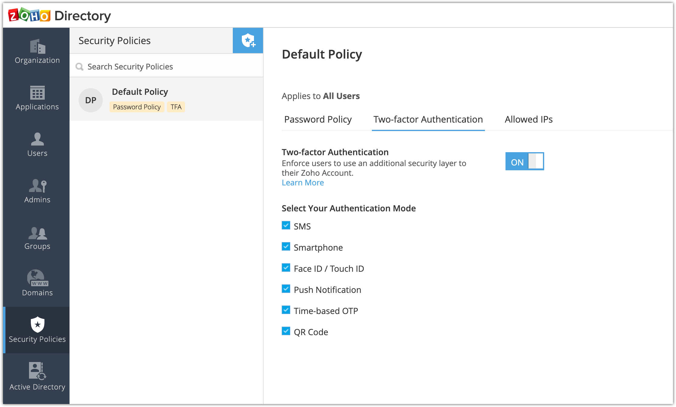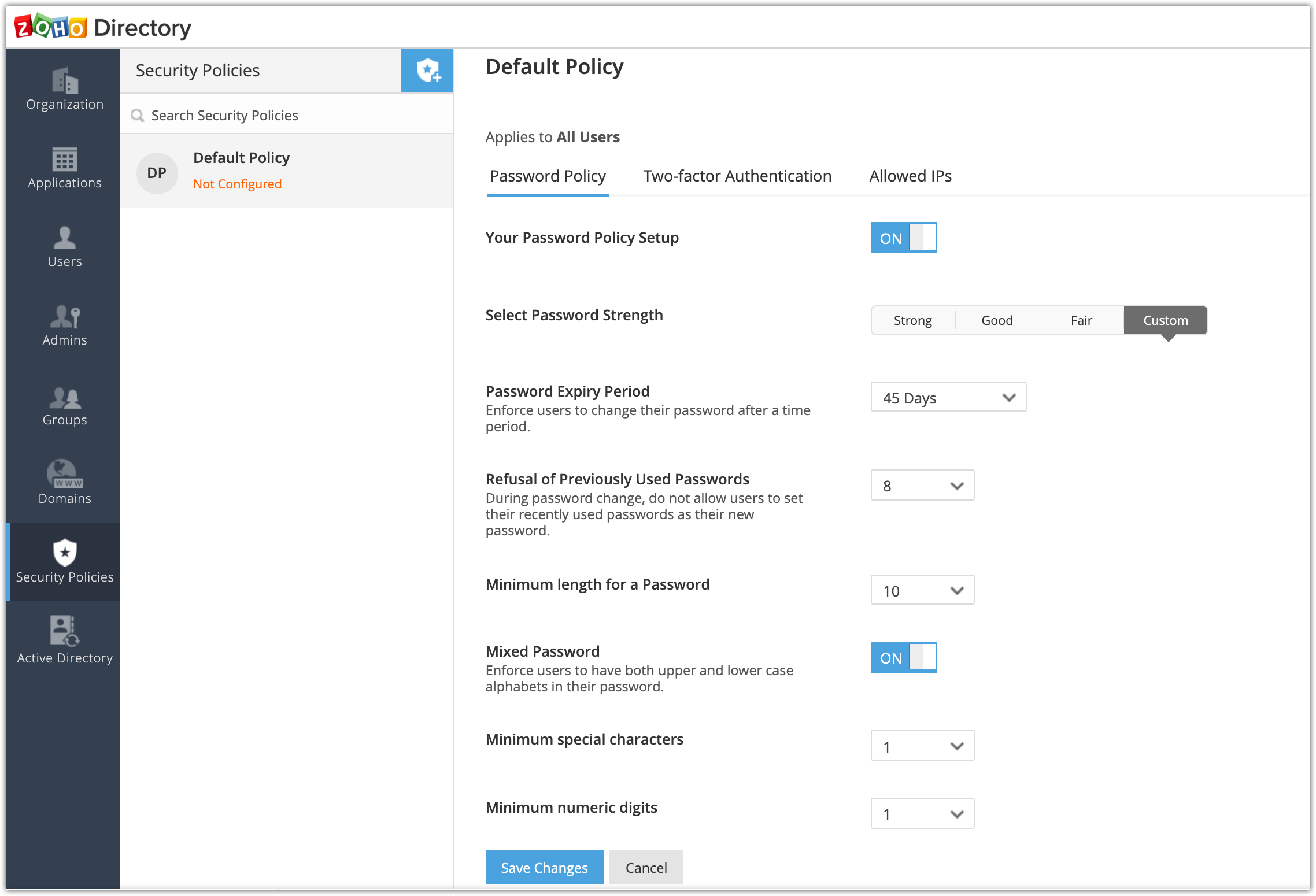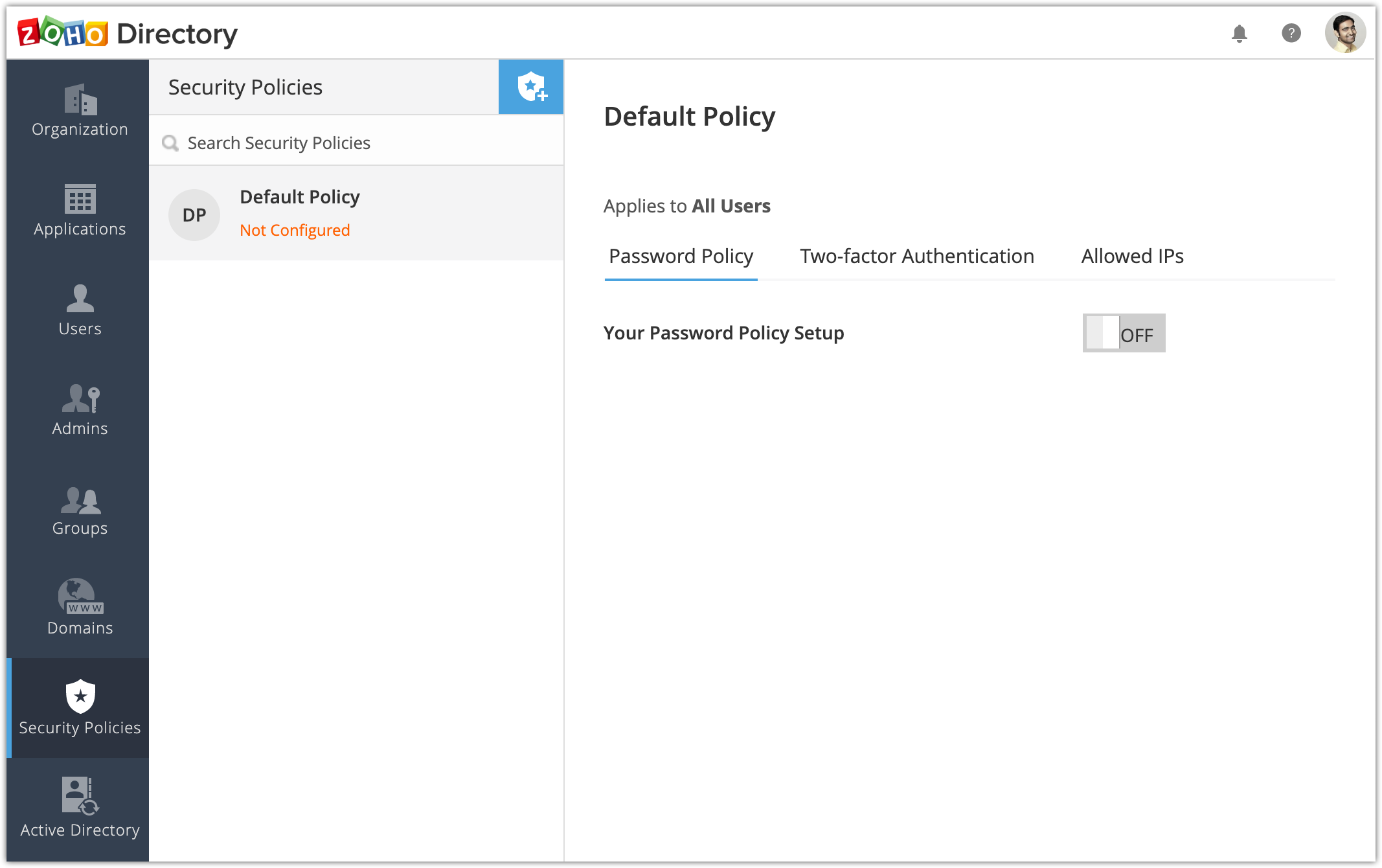 - 默认策略应用于 Zoho Directory 中的所有用户。