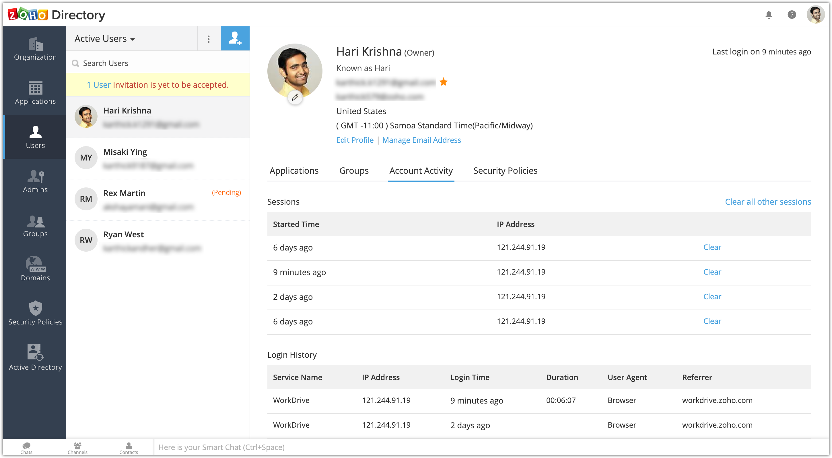 Zoho Directory 可帮您在一处管理用户和应用。您可以快速添加或邀请用户、更改角色,以及启用或禁用对应用的访问权限。您还可以对用户强制实施自定义安全策略,包括密码策略、双重身份验证,并设置允许的 IP 地址。