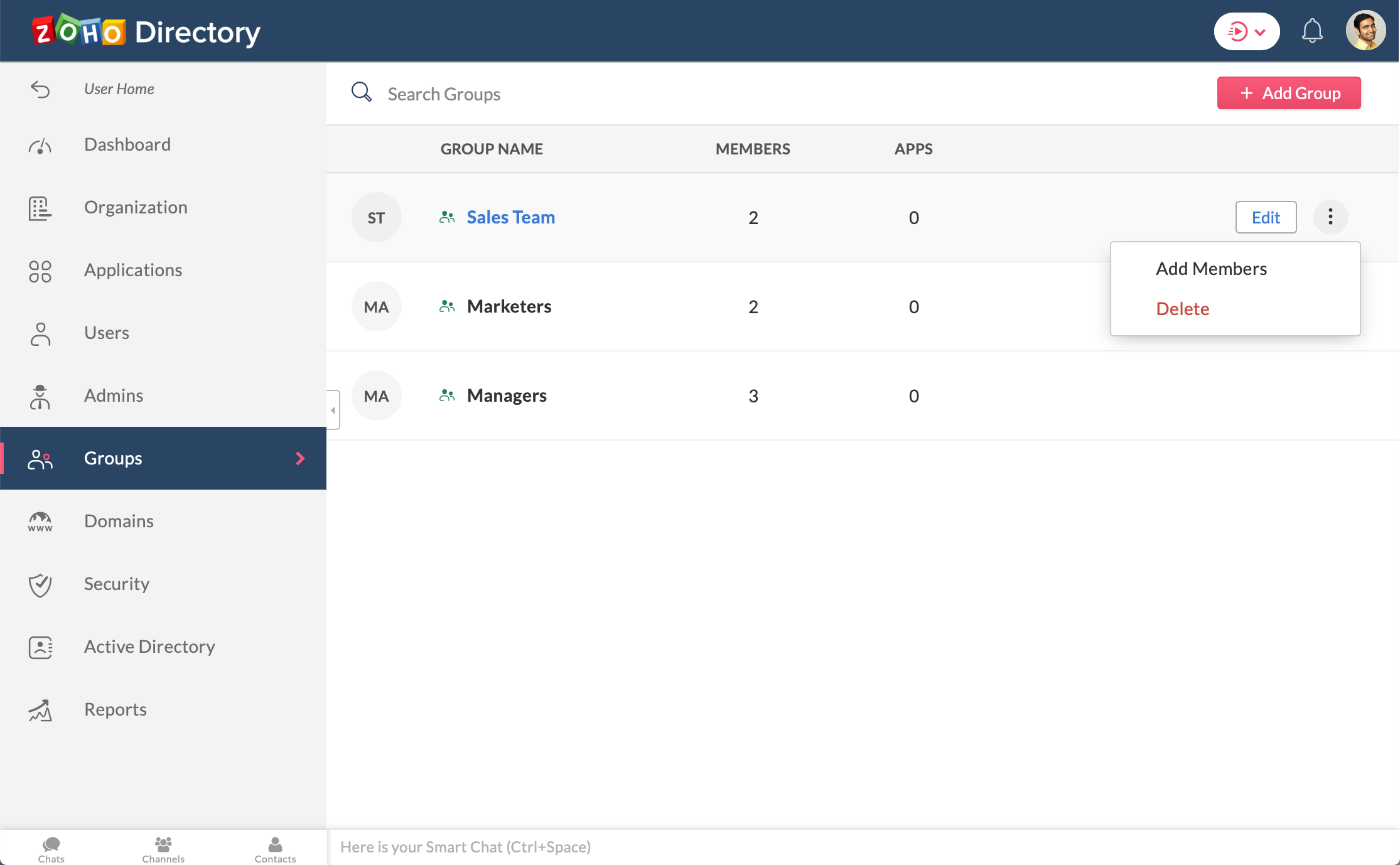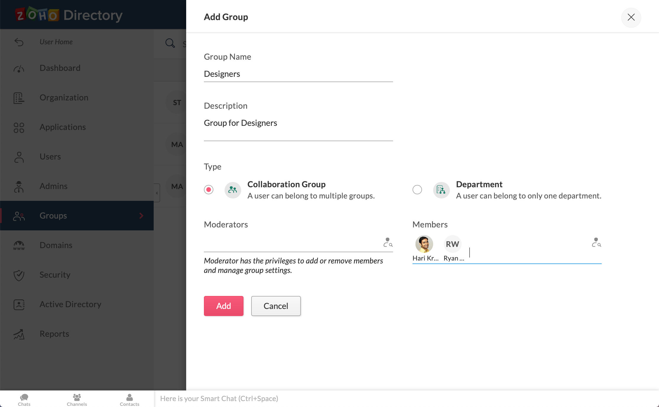 您可以通过在 Zoho Directory 中创建的机构群组向 WorkDrive 和其他 Zoho 应用中添加群组成员。