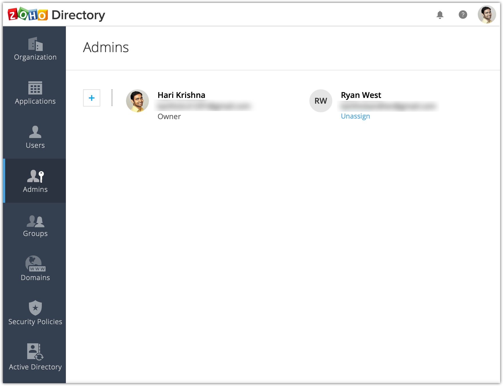 只有 Zoho Directory 的所有者或管理员才能将其他用户分配为管理员。