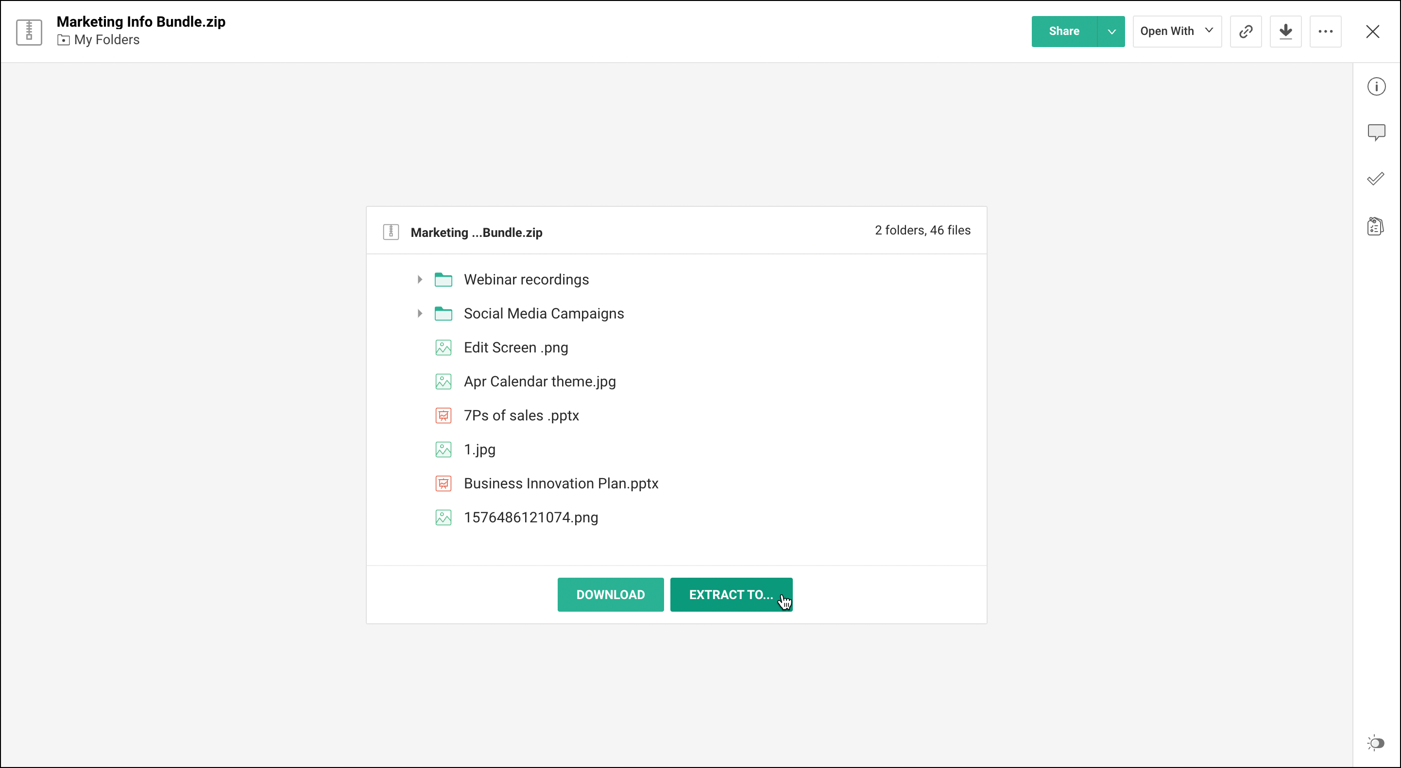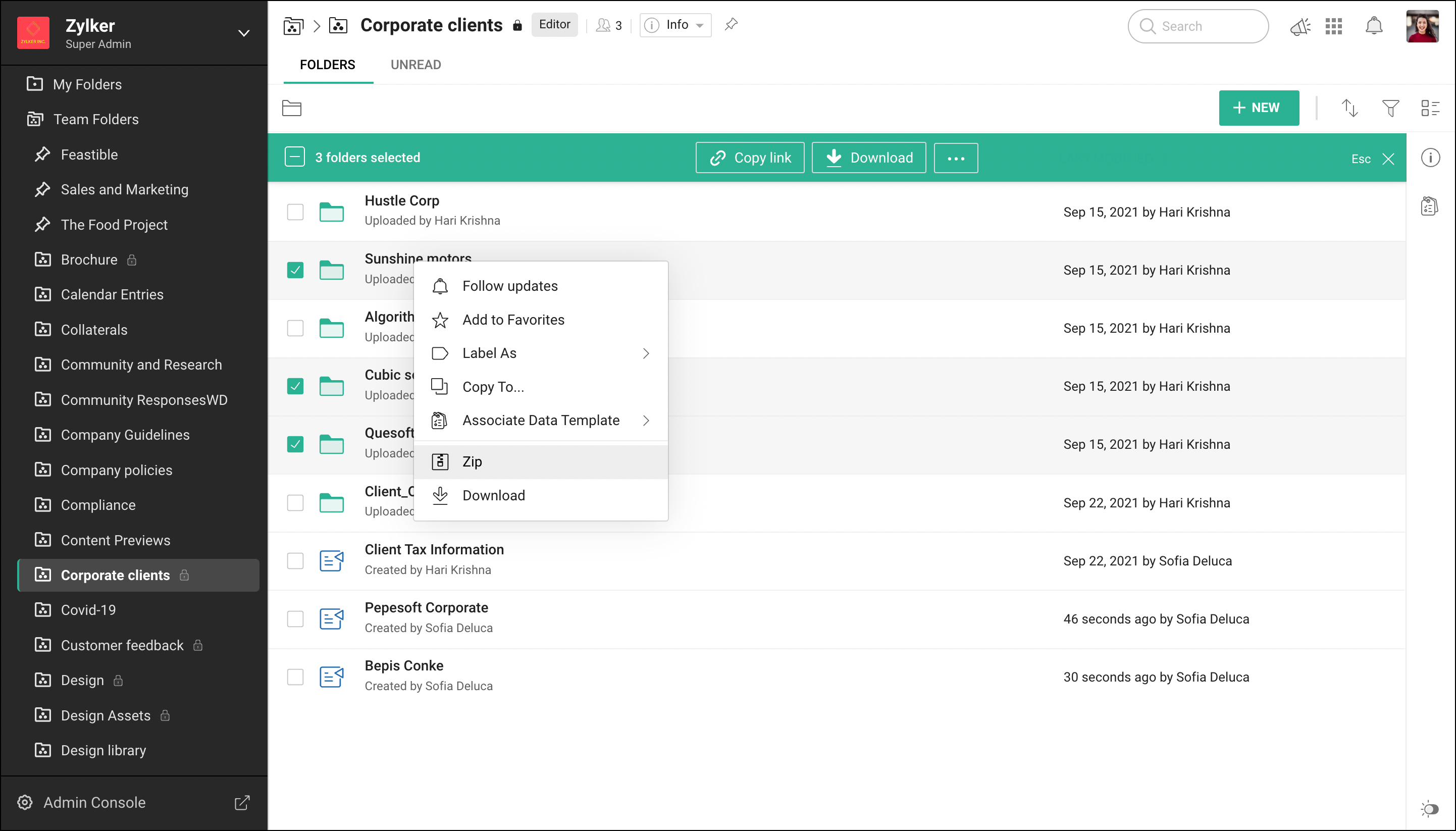 轻松创建压缩文件,以便在 WorkDrive 网络中备份多个文件和文件夹。如果您要将此类数据存储在计算机中,可以随时下载压缩文件并提取其中的项目。