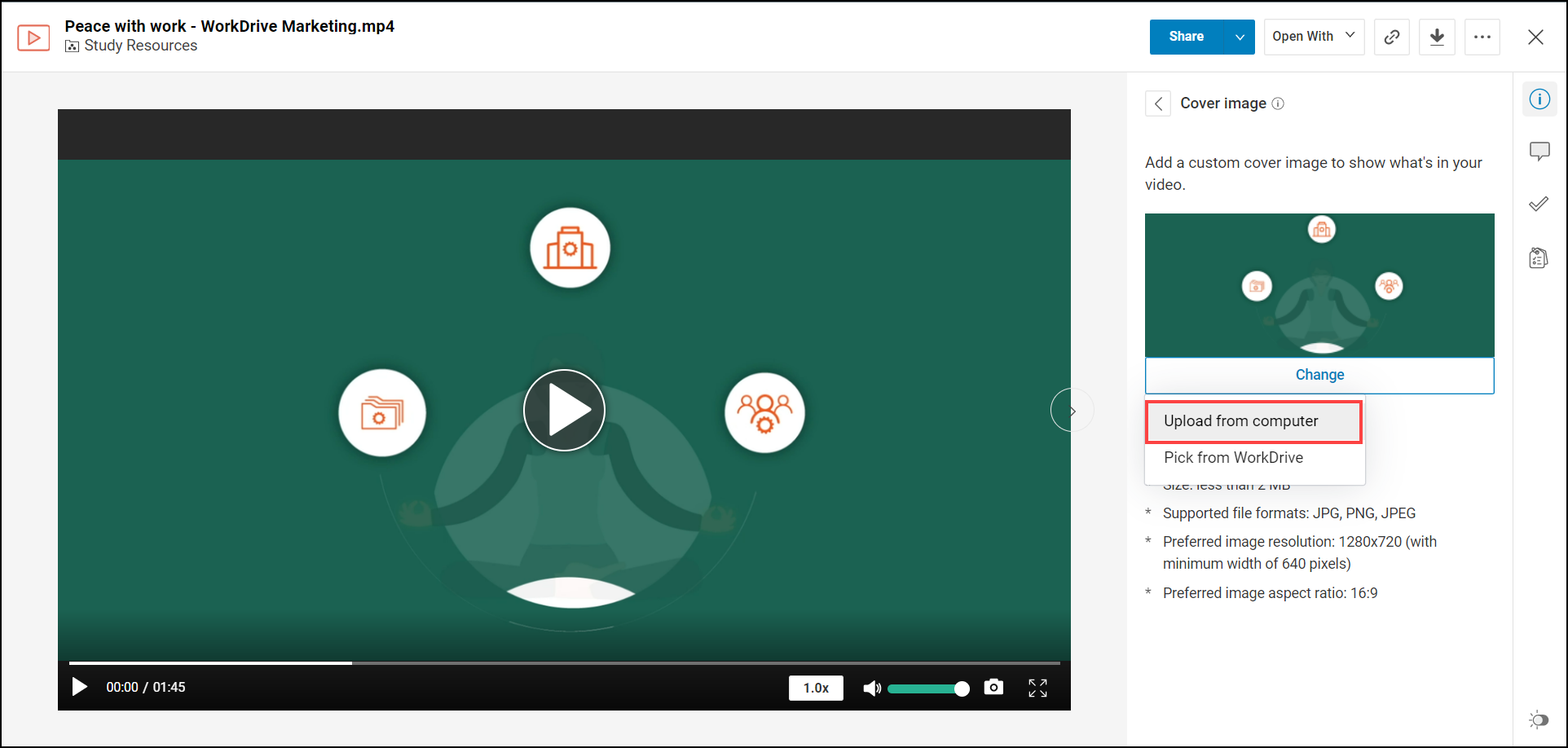 Zoho WorkDrive 允许您将系统生成的默认视频封面图片修改为自定义封面图片,以便准确展示视频中的内容。