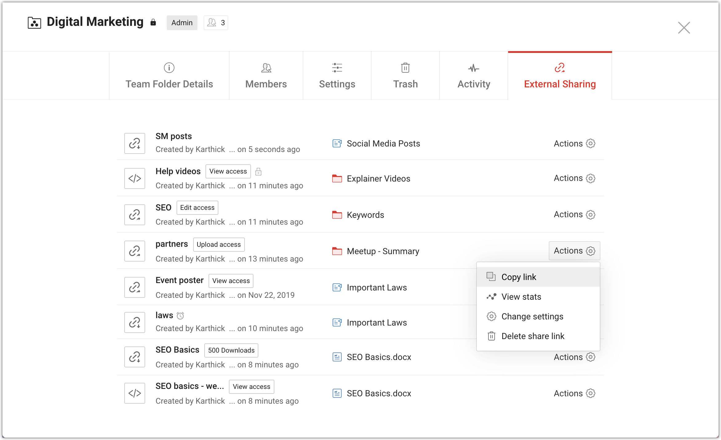 团队文件夹中的管理员和组织者可以在一个位置查看和管理其所有外部共享链接、下载链接和嵌入代码。这将有助于他们轻松监控所有对外共享的文件和文件夹。