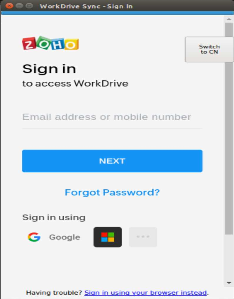 尝试在设备上安装 WorkDrive Sync 之前,请确保您的操作系统是 Windows 7 或更高版本。 下载适用于 Windows 操作系统的 WorkDrive Sync 应用(下载链接)。 重要提示:在同意下载 WorkDrive Sync 应用前,请务必阅读许可协议和隐私政策。 双击下载的文件 (ZohoWorkDrive.msi) 开始安装。设置窗口将会打开。 单击安装。成功安装后,将显示 Zoho WorkDrive 登录屏幕。 输入您的 Zoho 帐户凭据以登录。 您还可以使用 ...