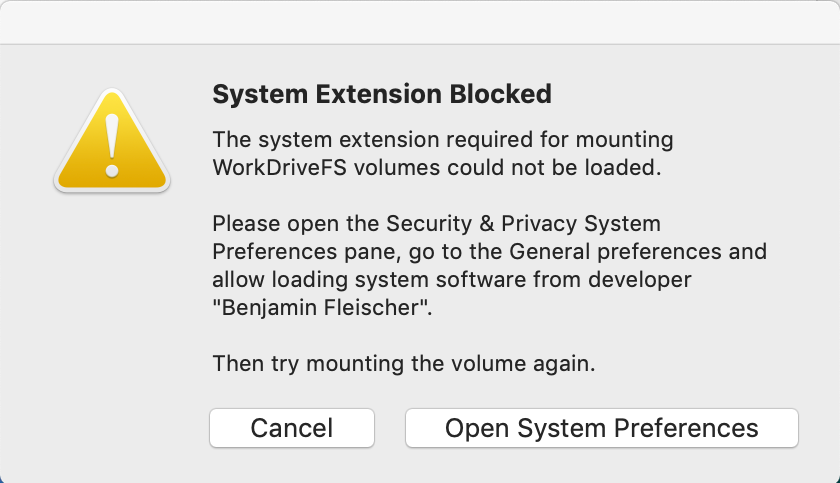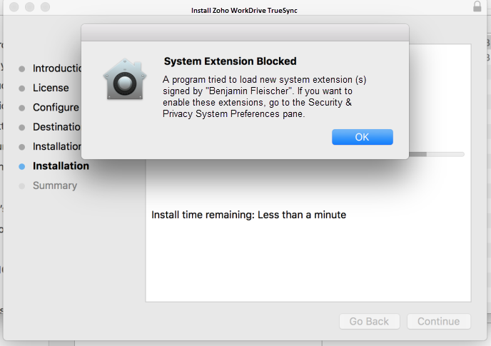 当您尝试安装 WorkDrive TrueSync 应用时,或者在 Mac 操作系统中安装应用后,您可能会收到“系统扩展程序被阻止”警告。必须允许系统扩展程序才能使用 WorkDrive TrueSync。